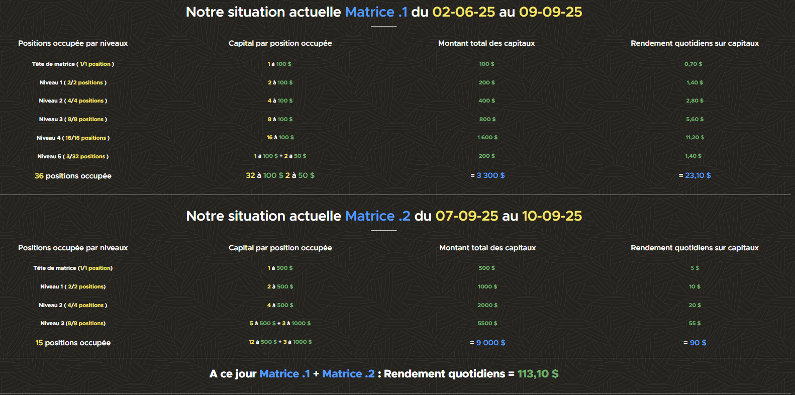 À titre de rappel : les positions Mousquetaire, ainsi que toutes les futures positions Mousquetaire, resteront toujours contributives à la caisse commune, sans limite de capital atteint. Ainsi, tout rendement issu de ces positions, appartenant à la communauté dans notre matrice générale, sera réinjecté indéfiniment dans la caisse commune.